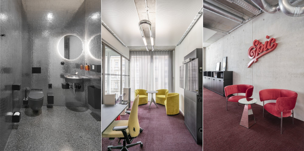 Studio Karhard har utformat byggnaden stilfullt och tankarna förs till 80-talets "glamour punk" med mycket stål, glas och glitter. Här hittar man rostfria mosaiker men också färglada mattor och glänsande planteringskärl. Man har valt att använda ett flertal av Svedholm Designs produkter så som