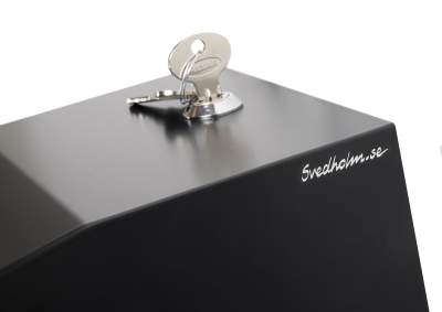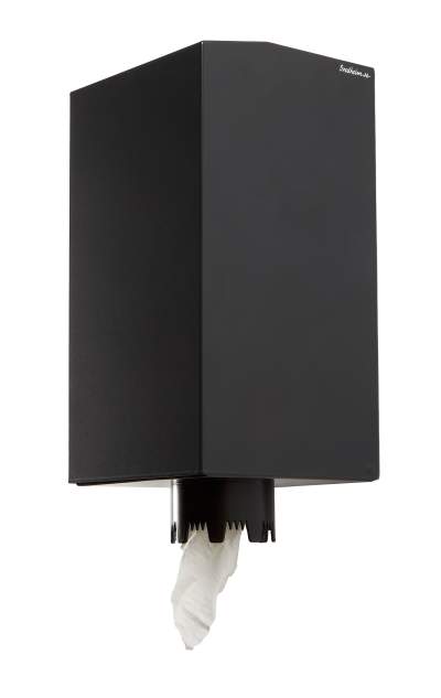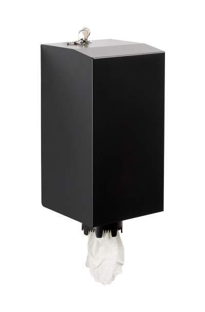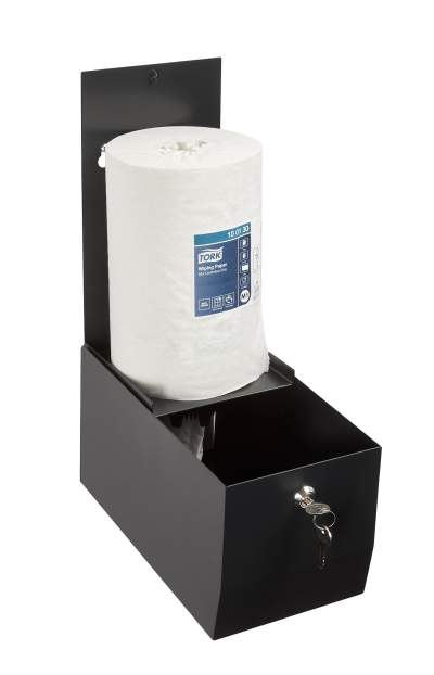 En låsbar pappershållare i pulverlackat stål. Alla färger går att få på förfrågan. Anpassad för avtorkningspapper centrummatad 215 × 140 × 140 mm. Tork M1 eller motsvarande.