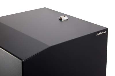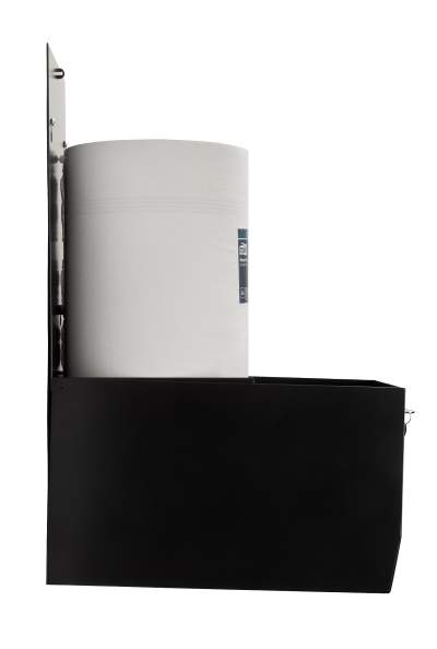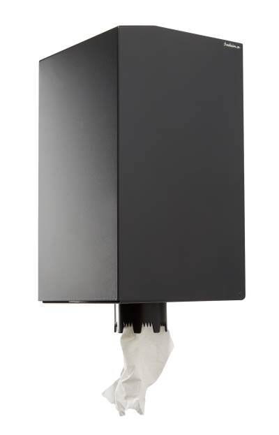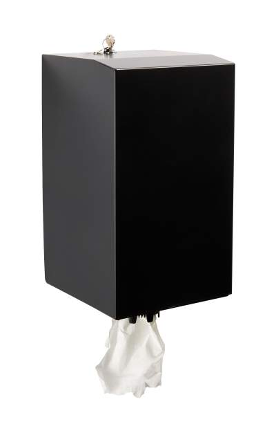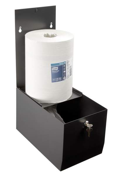 En låsbar pappershållare i pulverlackat stål. Alla färger går att få på förfrågan. Anpassad för avtorkningspapper centrummatad 245 × 190 × 190mm. Tork M2 eller motsvarande.
