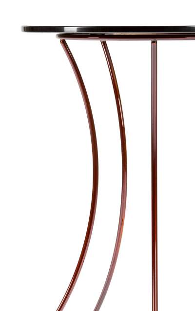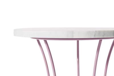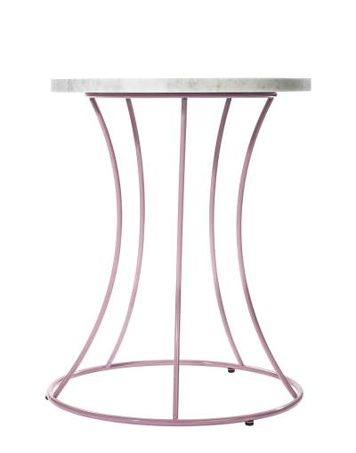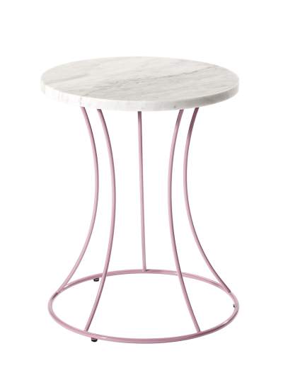 Ett sidobord i tråd, med skiva i härdat glas med keramisk färg, träfanér alternativt marmor. Stommen i pulverlackad tråd. Alla färger går att få på förfrågan. OMFATTAS AV VÅRT RETURSYSTEM, TILLVERKAD I SVERIGE