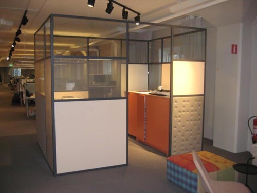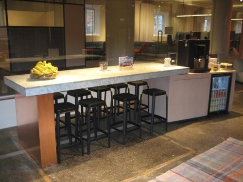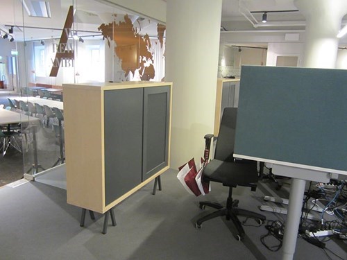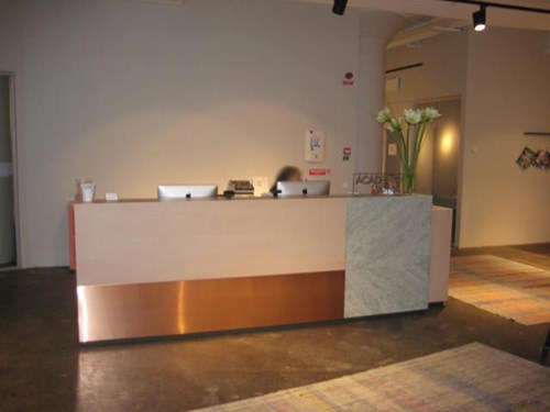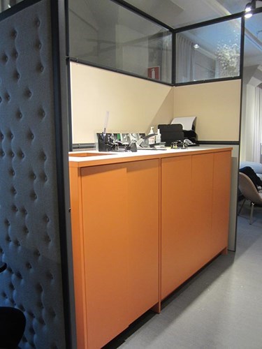 Receptionsdiskar, förvaringsskåp, kopiatorstationer, barbord och skyltar.
