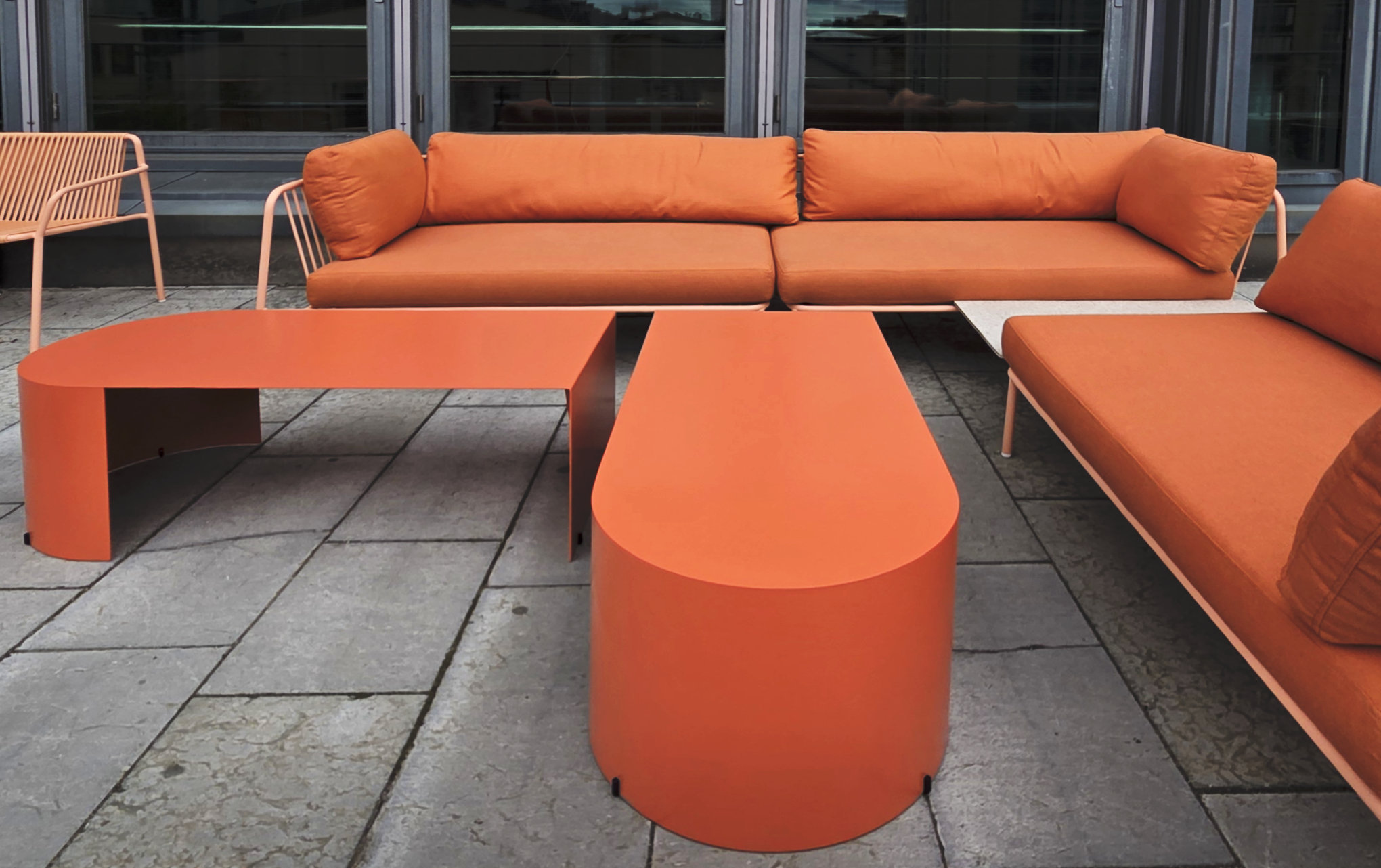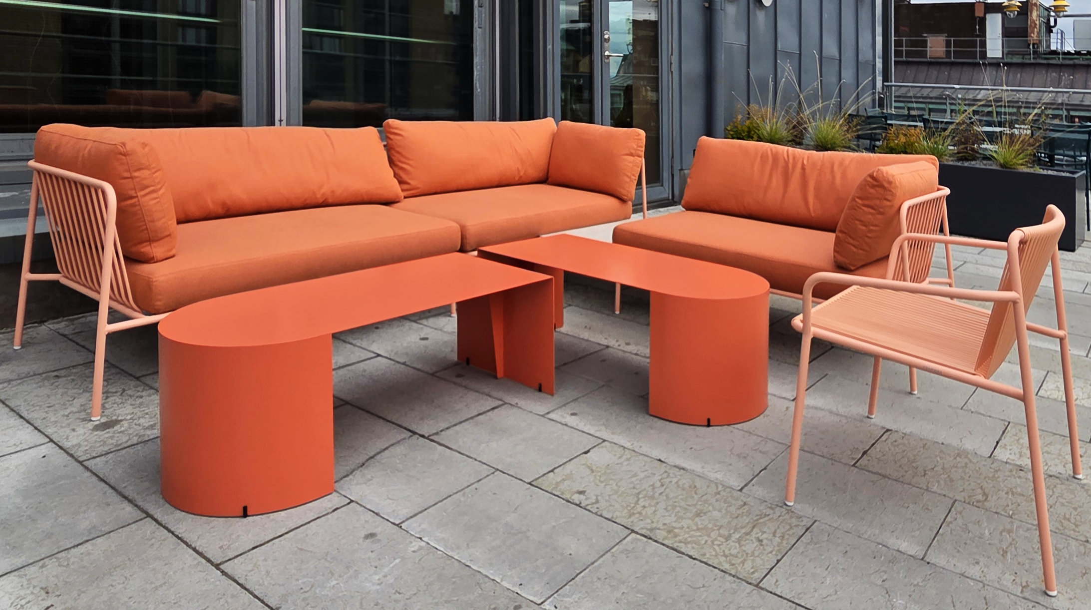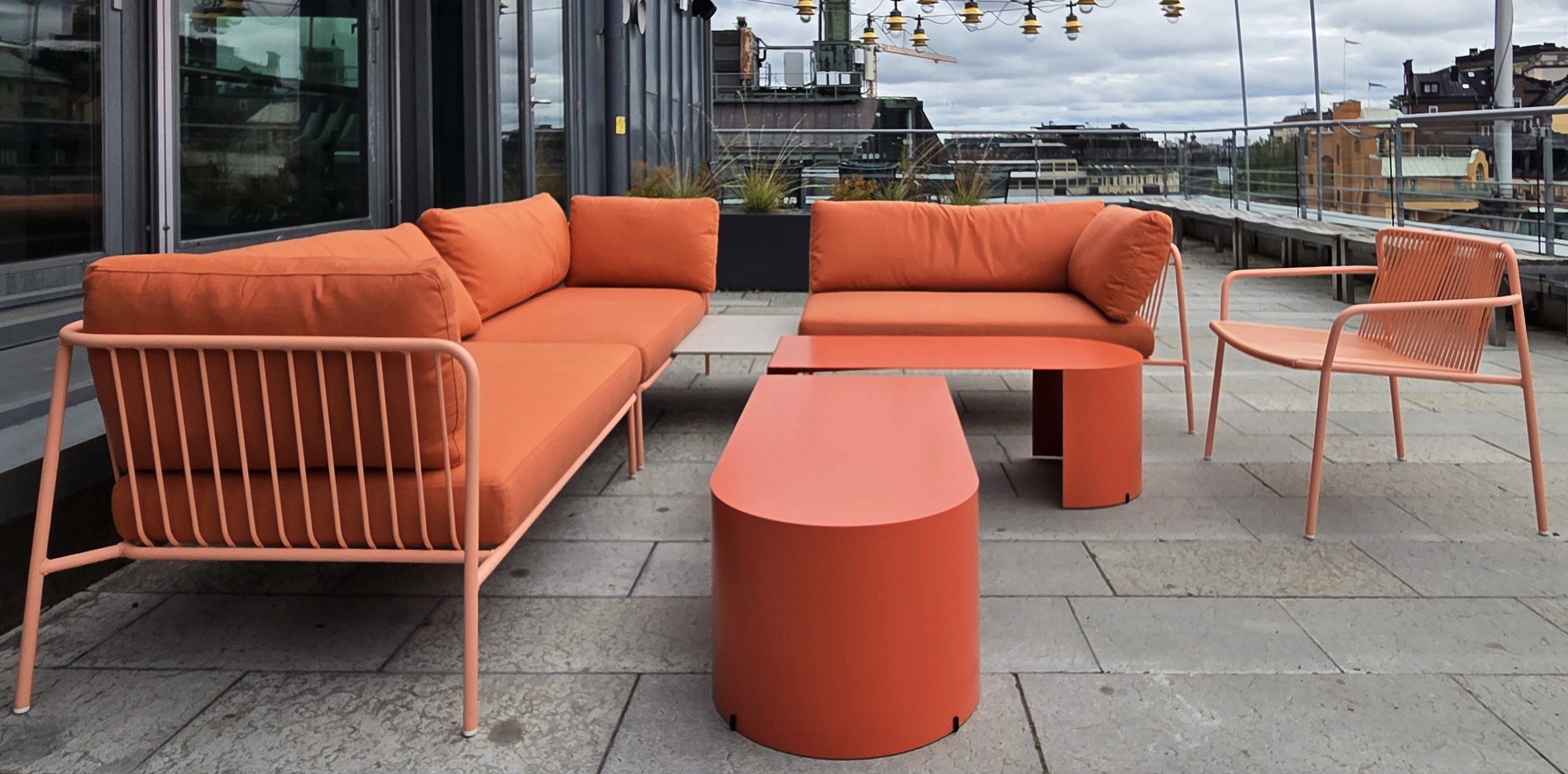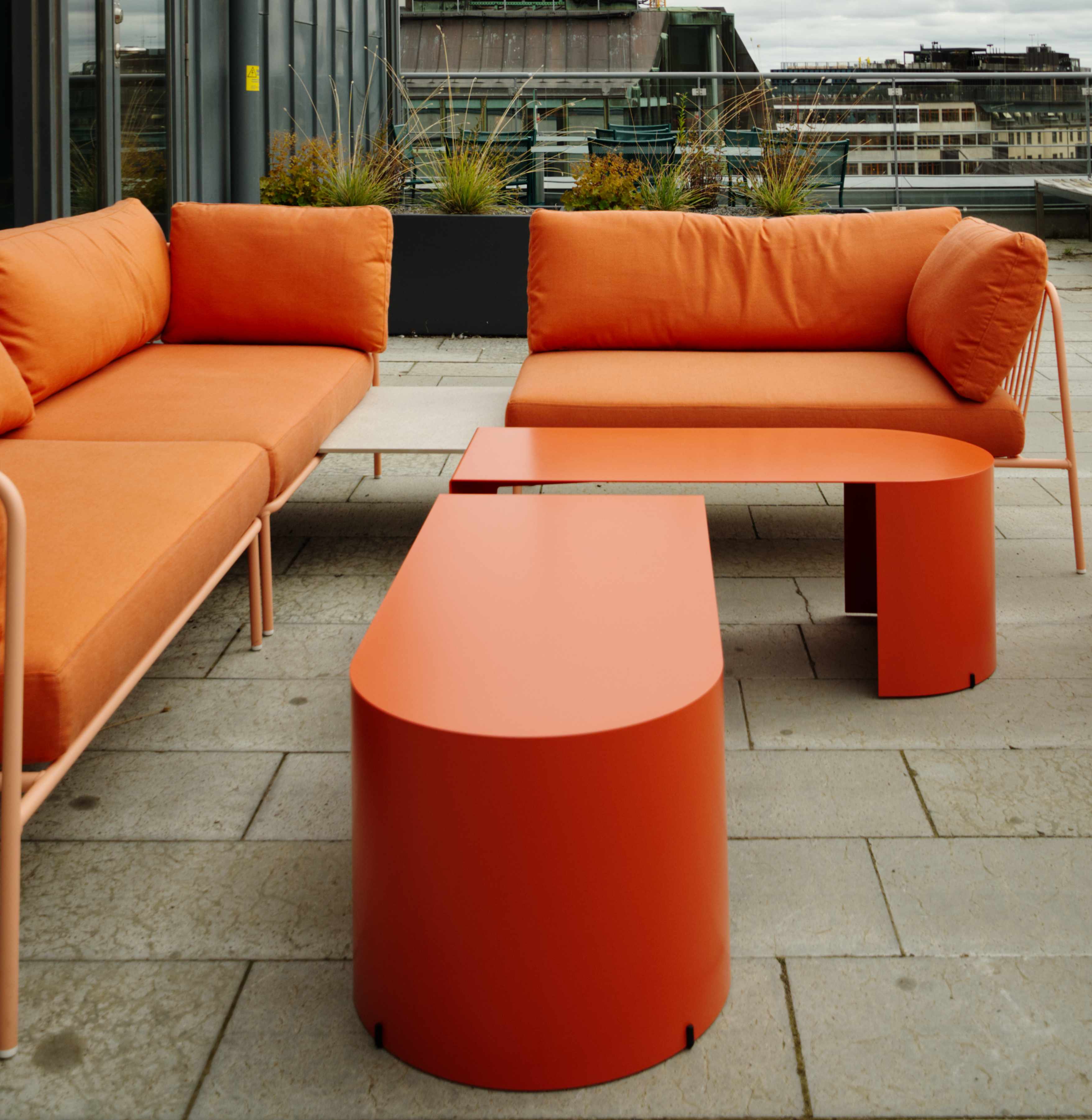 En fikapaus på takterrass med Söders höjder framför sig känns fint. Våra soffbord Curve ytbehandlade för utomhusbruk pryder sin plats hos Helio Slussen Coworking.