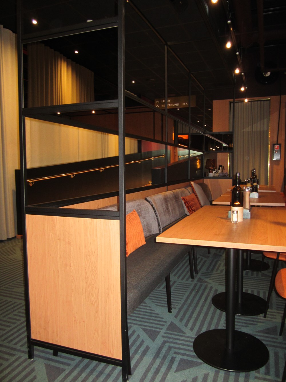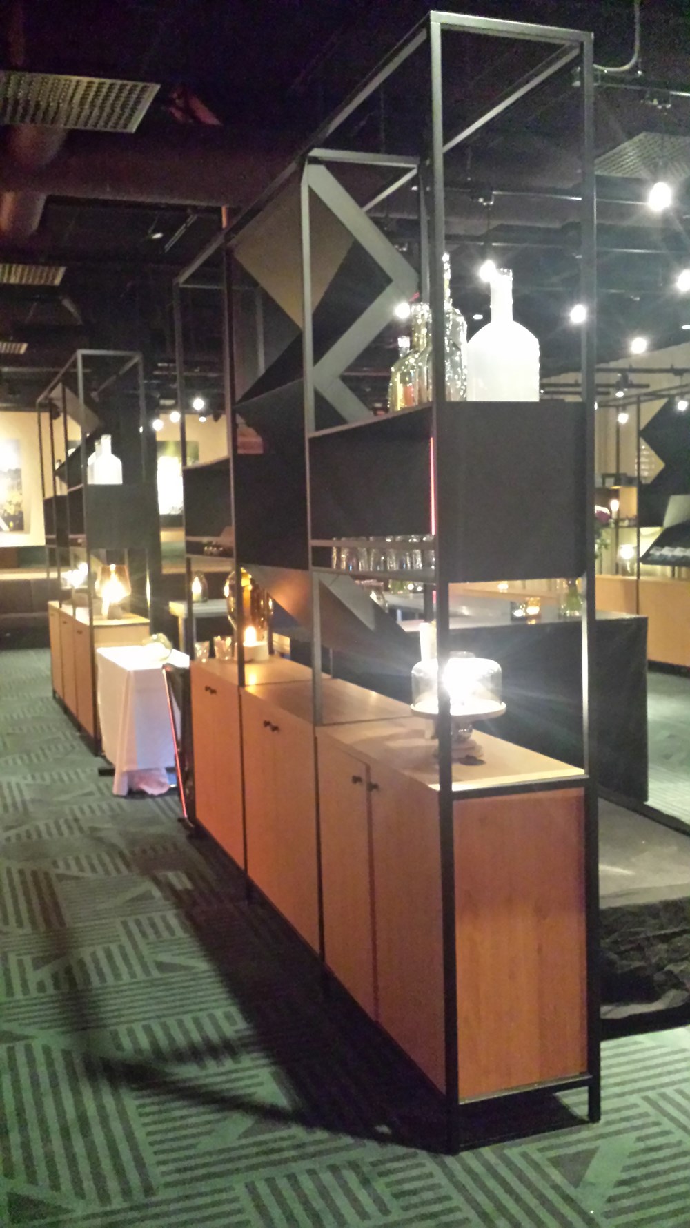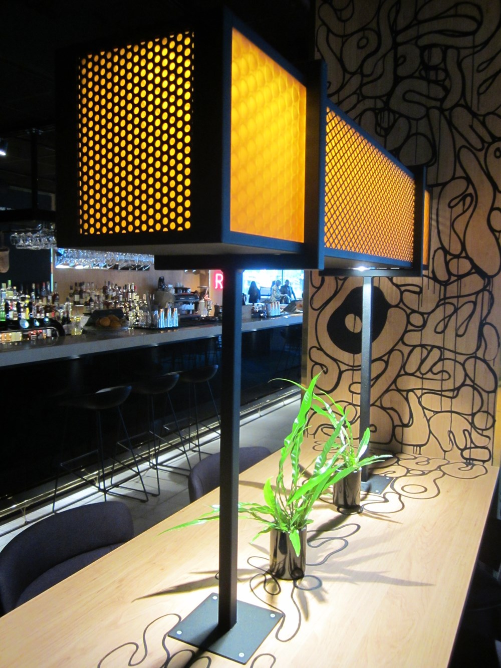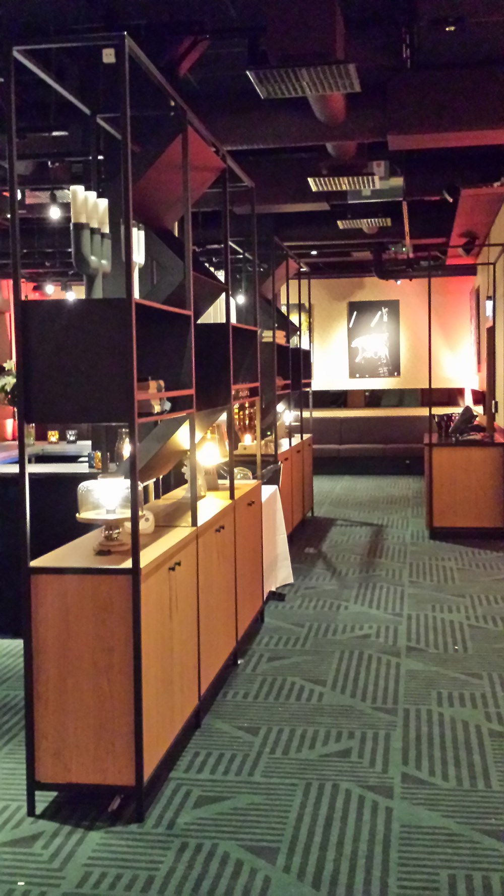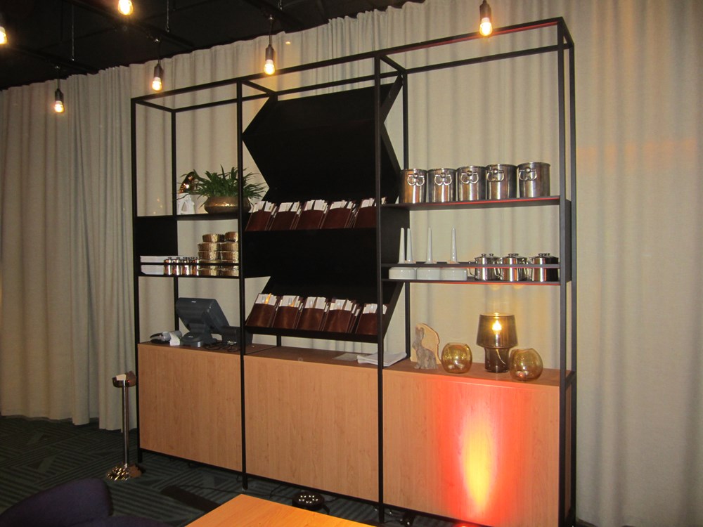 Buffémöbler, rumsavdelare, hyllor och ståbord med lampor måttanpassade för hotellet. Speglar måttanpassade för hotellet samt krokar.
