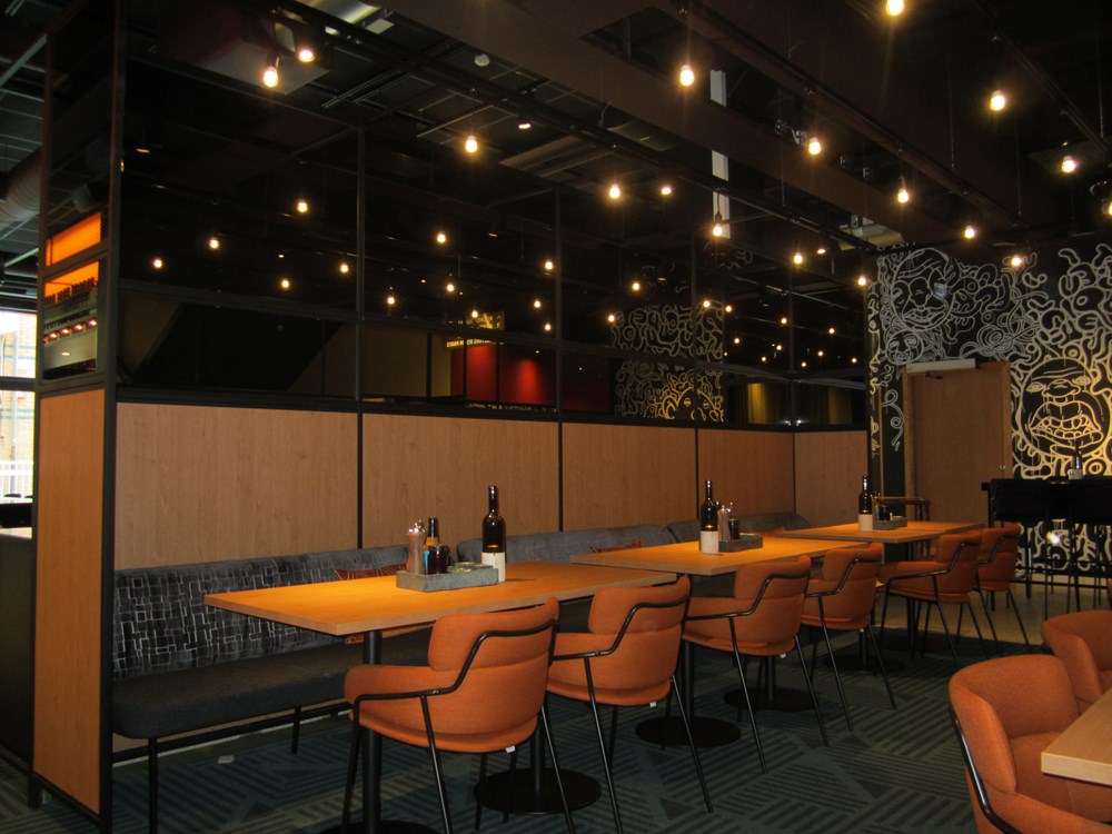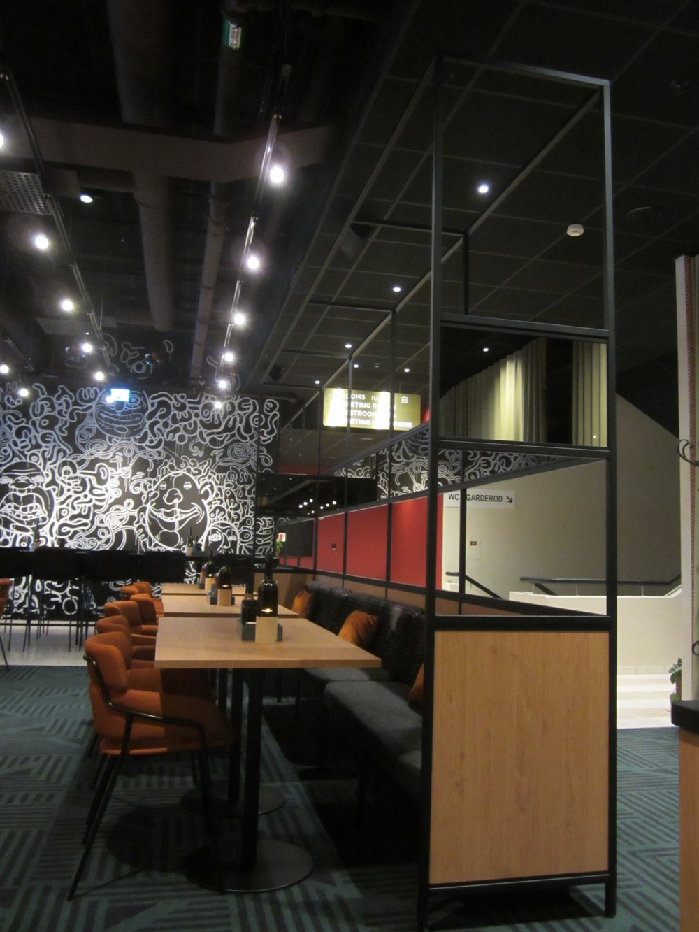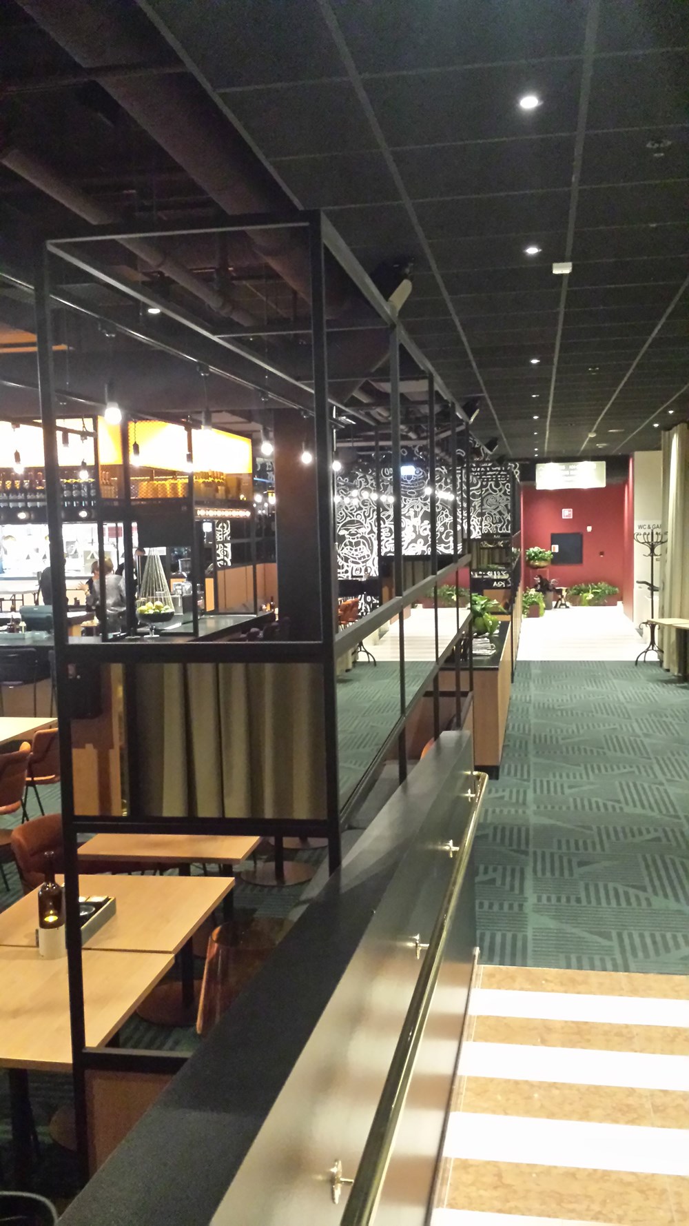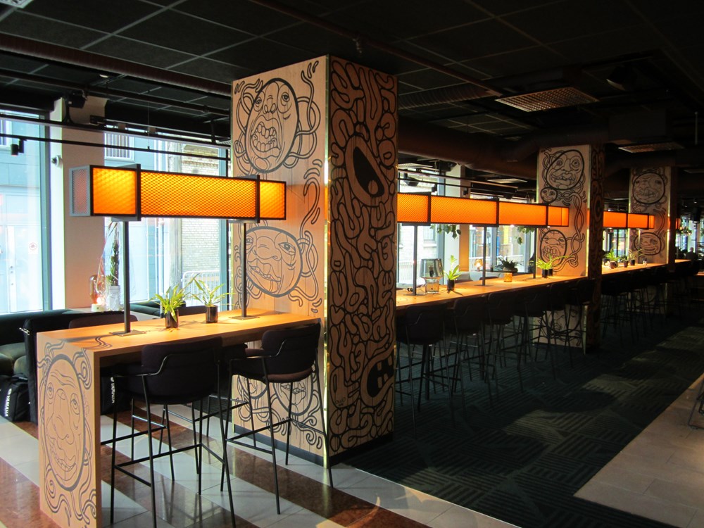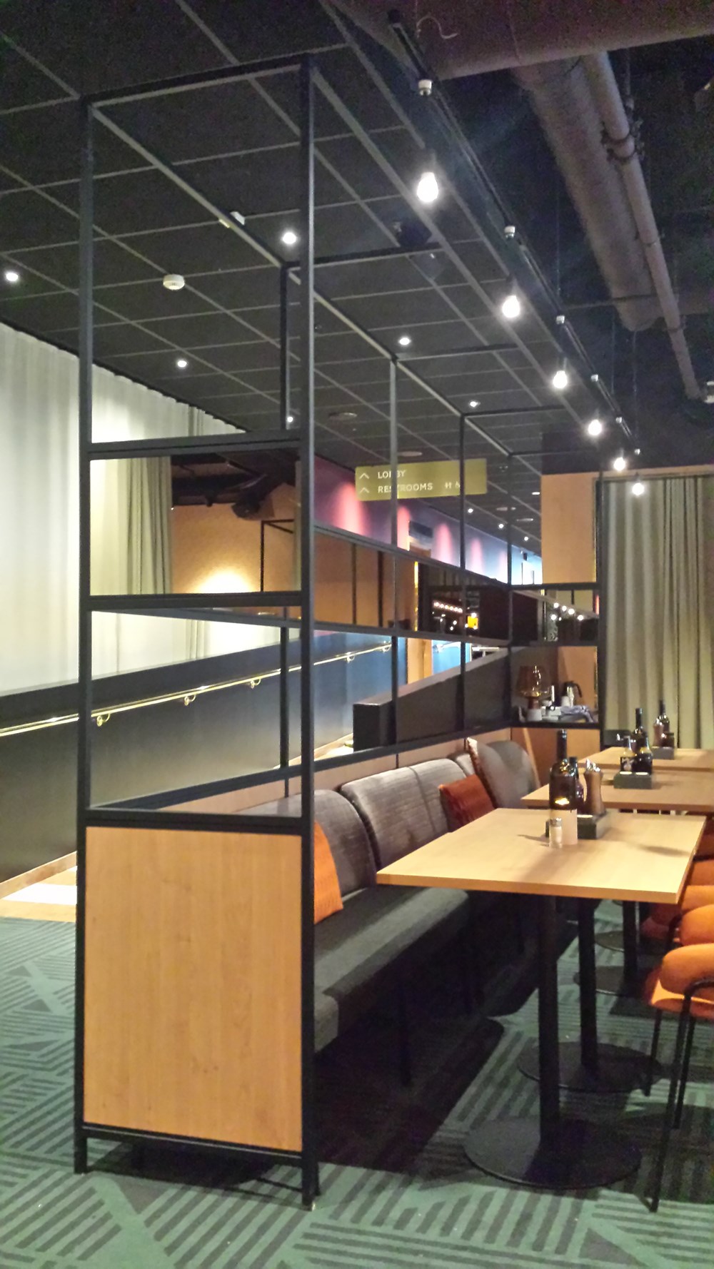 Buffémöbler, rumsavdelare, hyllor och ståbord med lampor måttanpassade för hotellet. Speglar måttanpassade för hotellet samt krokar.