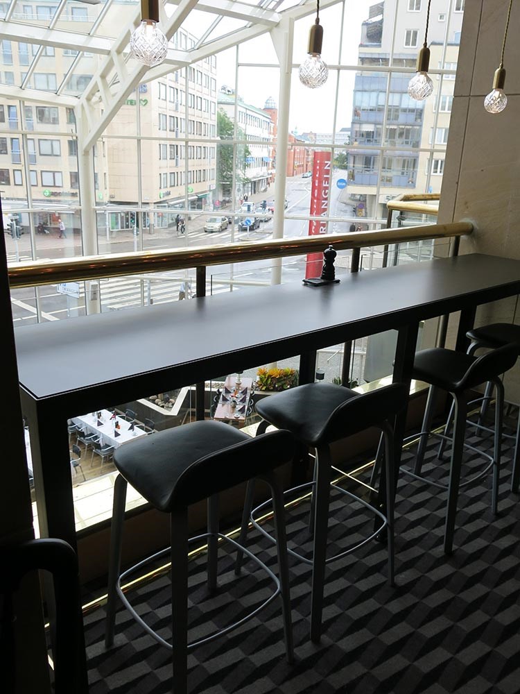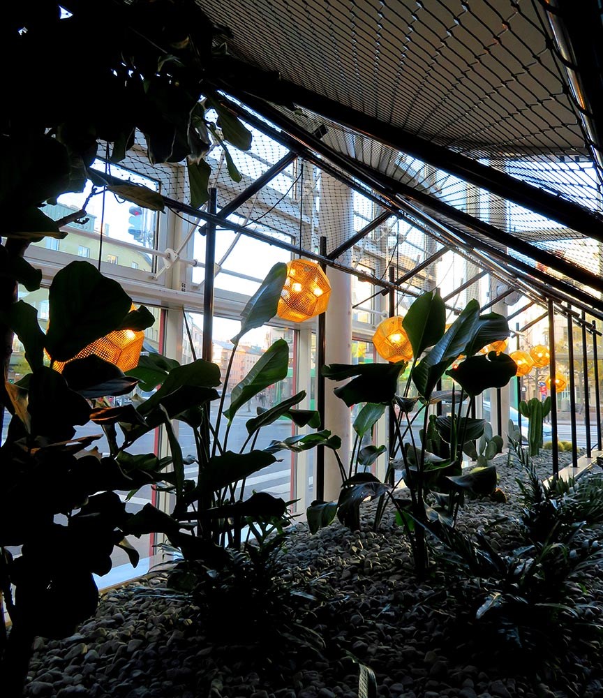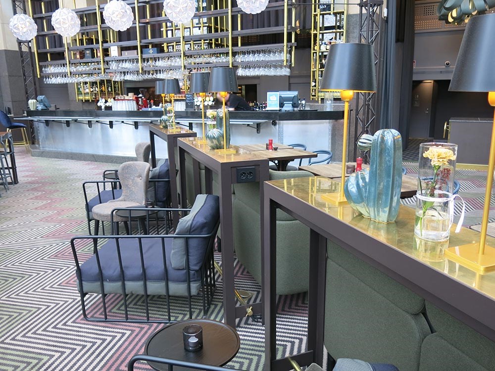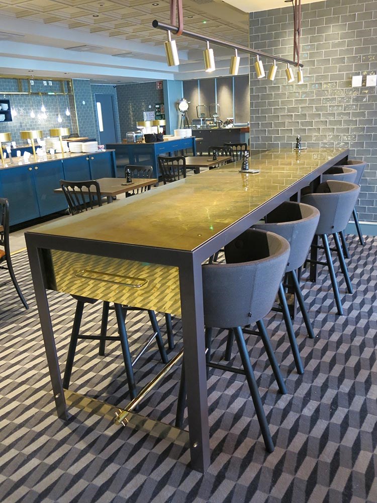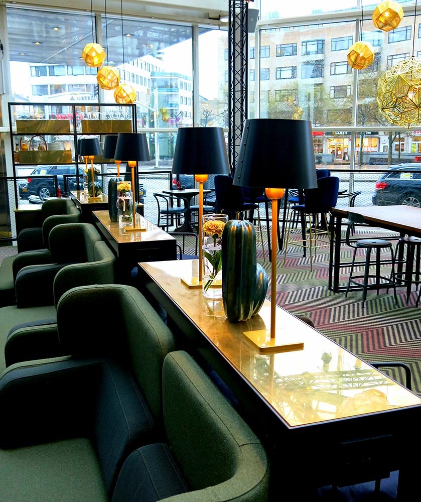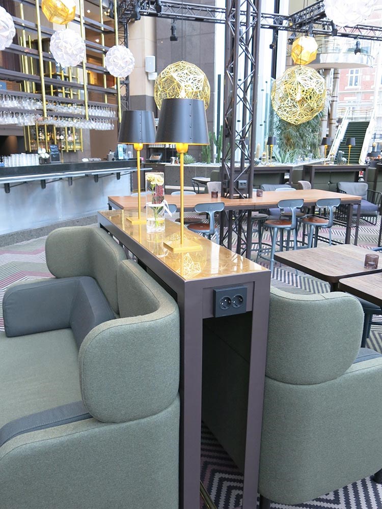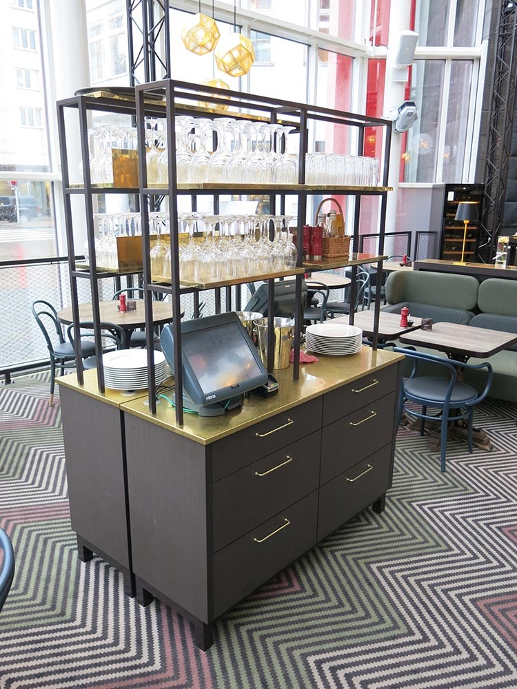 Buffémöbler, bord, hyllor och serveringsbord med lampor måttanpassade för hotellet. Bar och restaurang inredning.Bord och rumsavdelare i foajén. Växthuset.