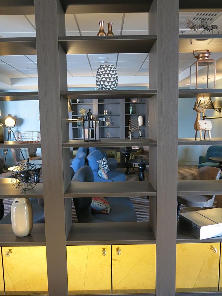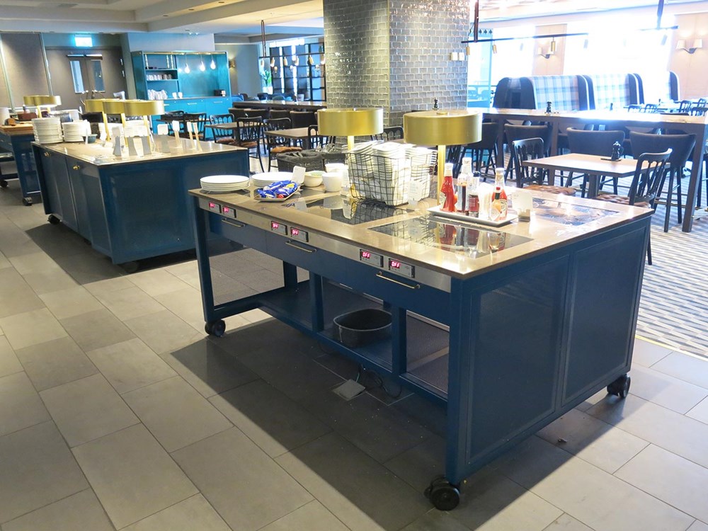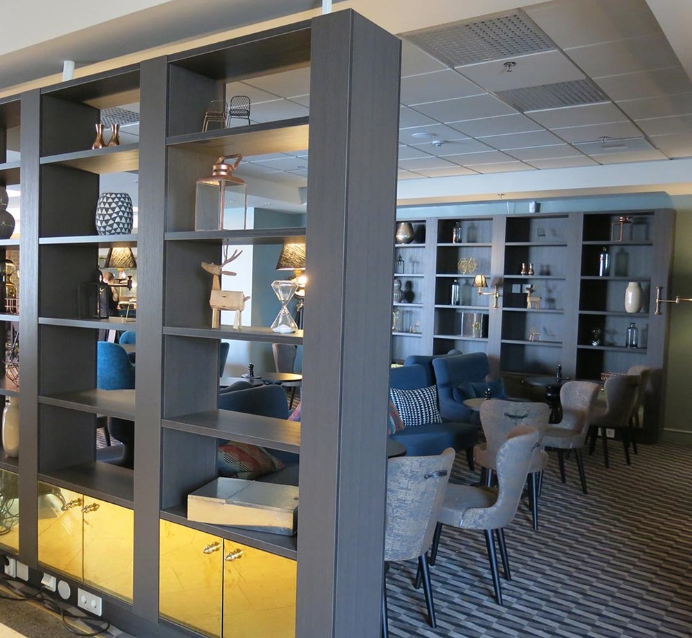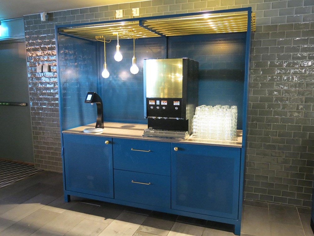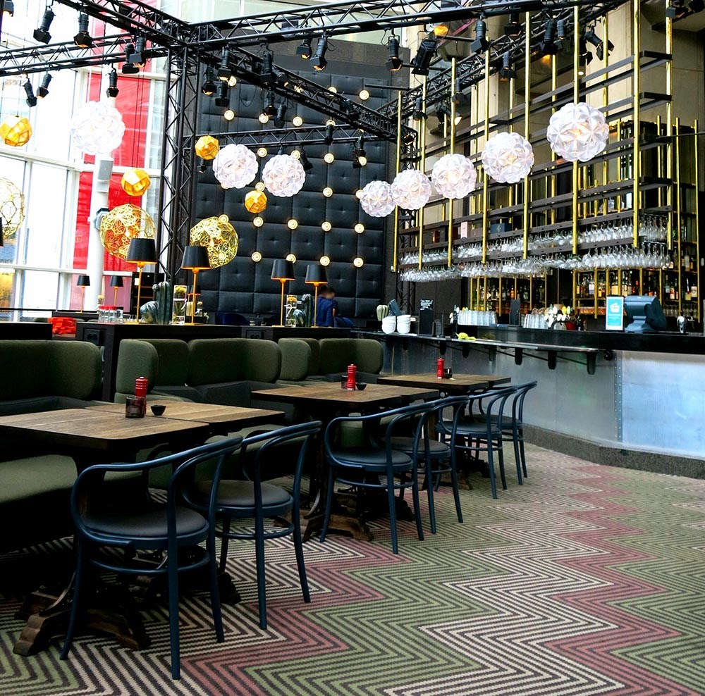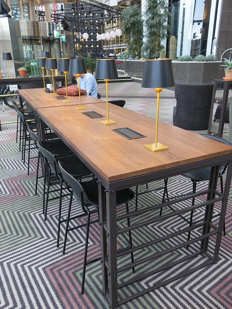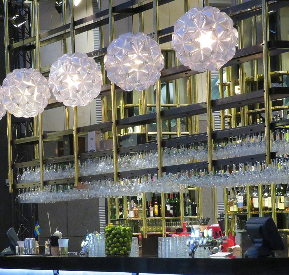 Buffémöbler, bord, hyllor och serveringsbord med lampor måttanpassade för hotellet. Bar och restaurang inredning.Bord och rumsavdelare i foajén. Växthuset.
