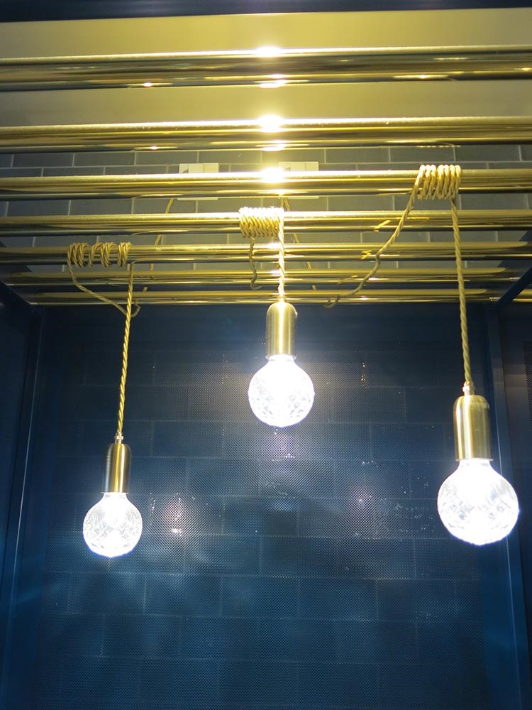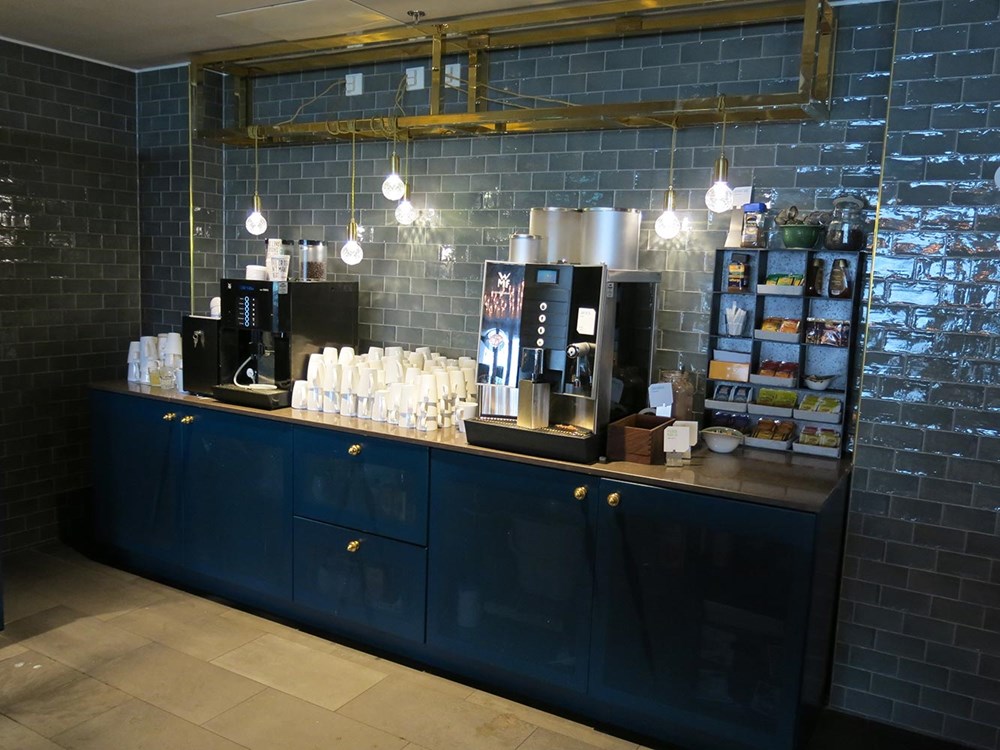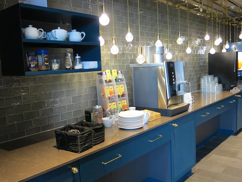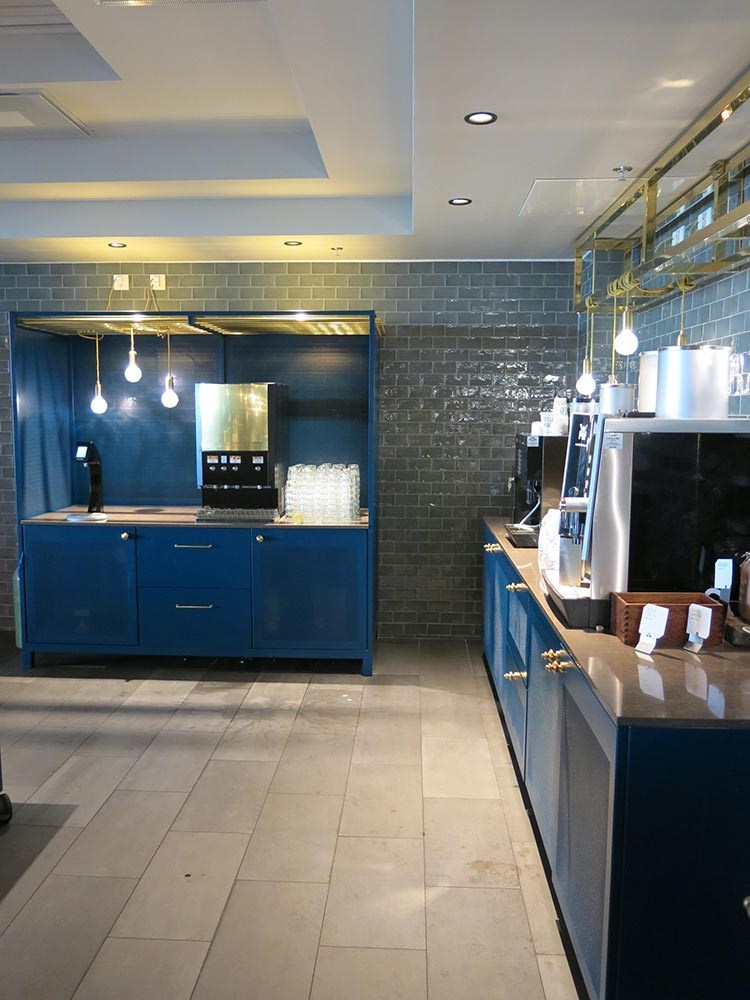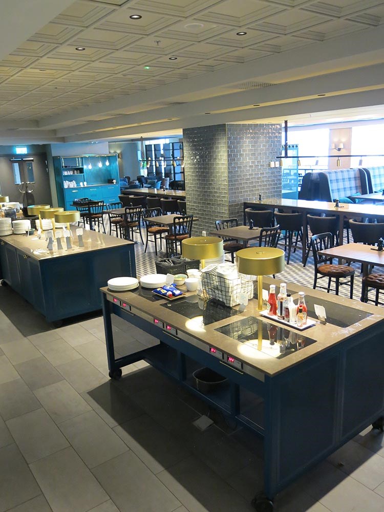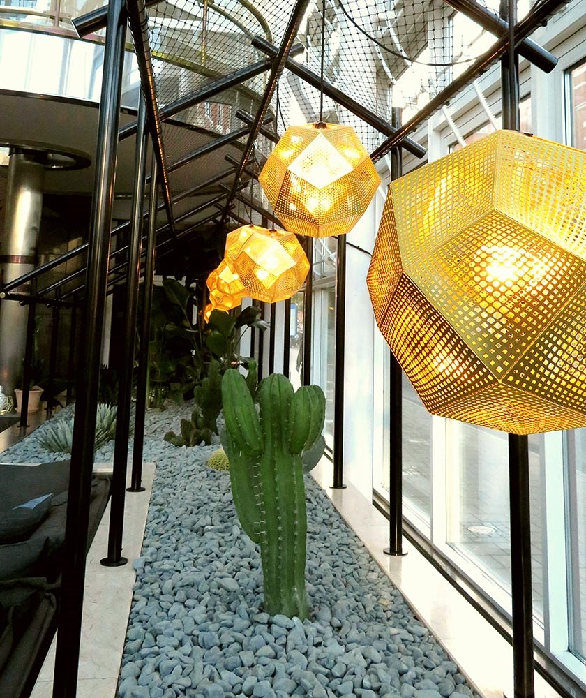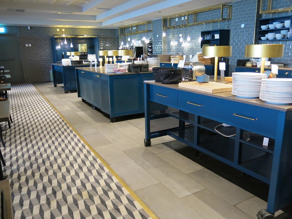 Buffémöbler, bord, hyllor och serveringsbord med lampor måttanpassade för hotellet. Bar och restaurang inredning.Bord och rumsavdelare i foajén. Växthuset.