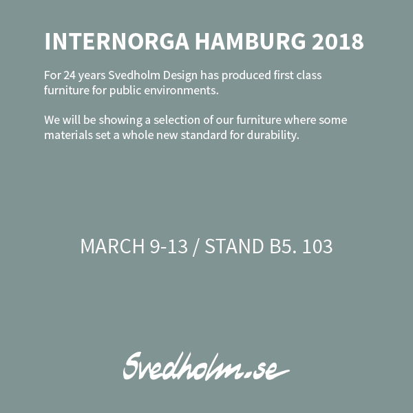 For 24 years Svedholm Design has produced first class furniture for public environments. At Internorga we will be showing a selection of our furniture where some materials set a whole new standard for durability. Welcome to stand B5. 103 on March 9-13.