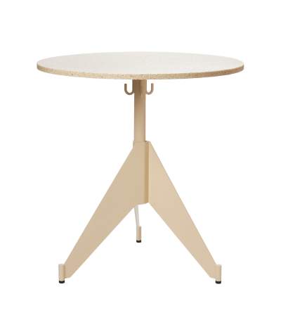 Ett oömt cafébord med stålunderrede och väskkrokar. Skivan går att få i ett flertal material. Alla färger går att få på förfrågan. OMFATTAS AV VÅRT RETURSYSTEM, TILLVERKAD I SVERIGE